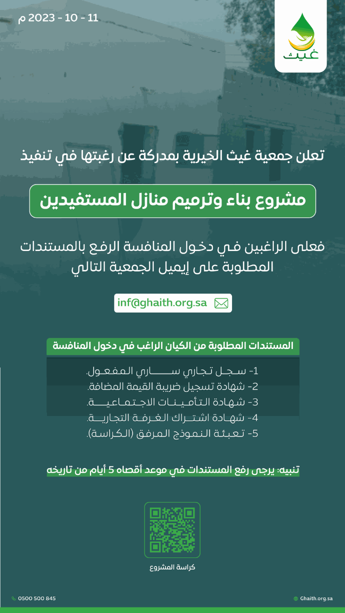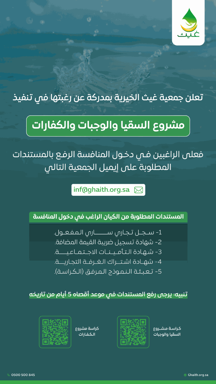تعلن جمعية غيث عن حاجتها لمنفذ لمشروع برادات سقيا الماء وصيانتها.